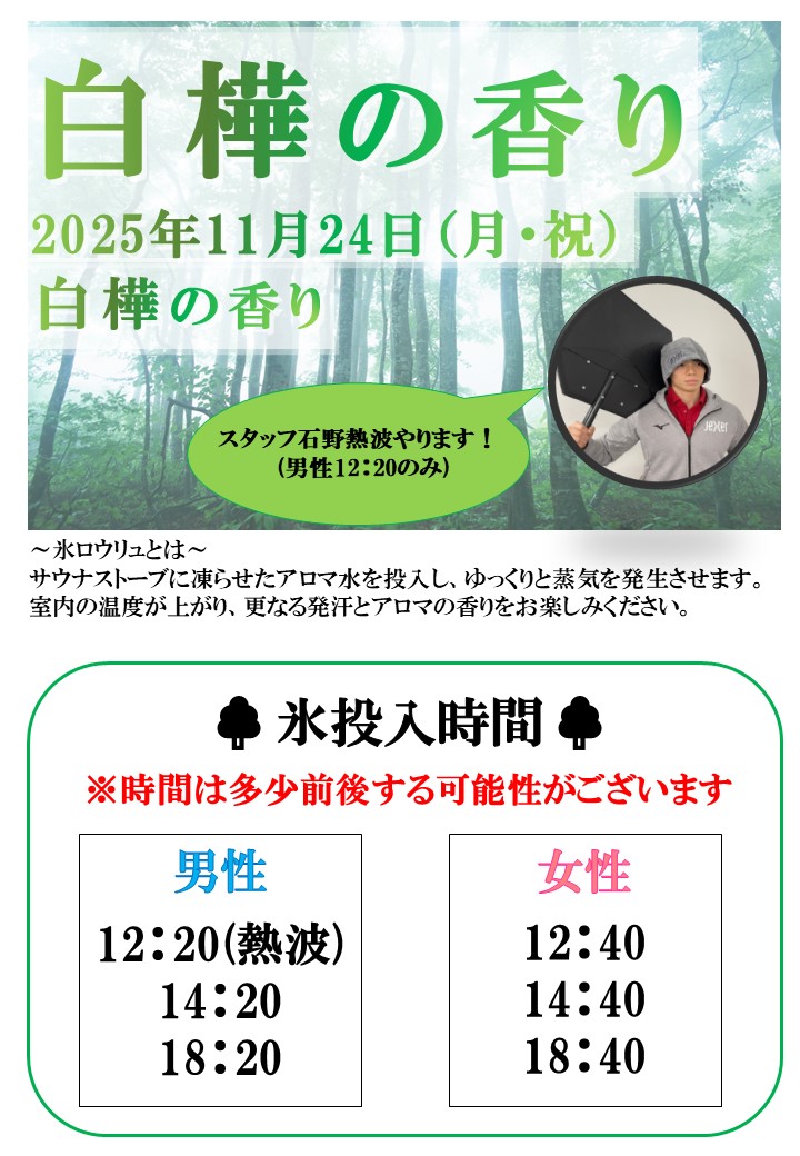 11月24日(月・祝) 男女サウナ室にてアロマで香りを付けた氷を投入して、ゆっくりと蒸気を発生させるロウリュイベントを開催いたします。